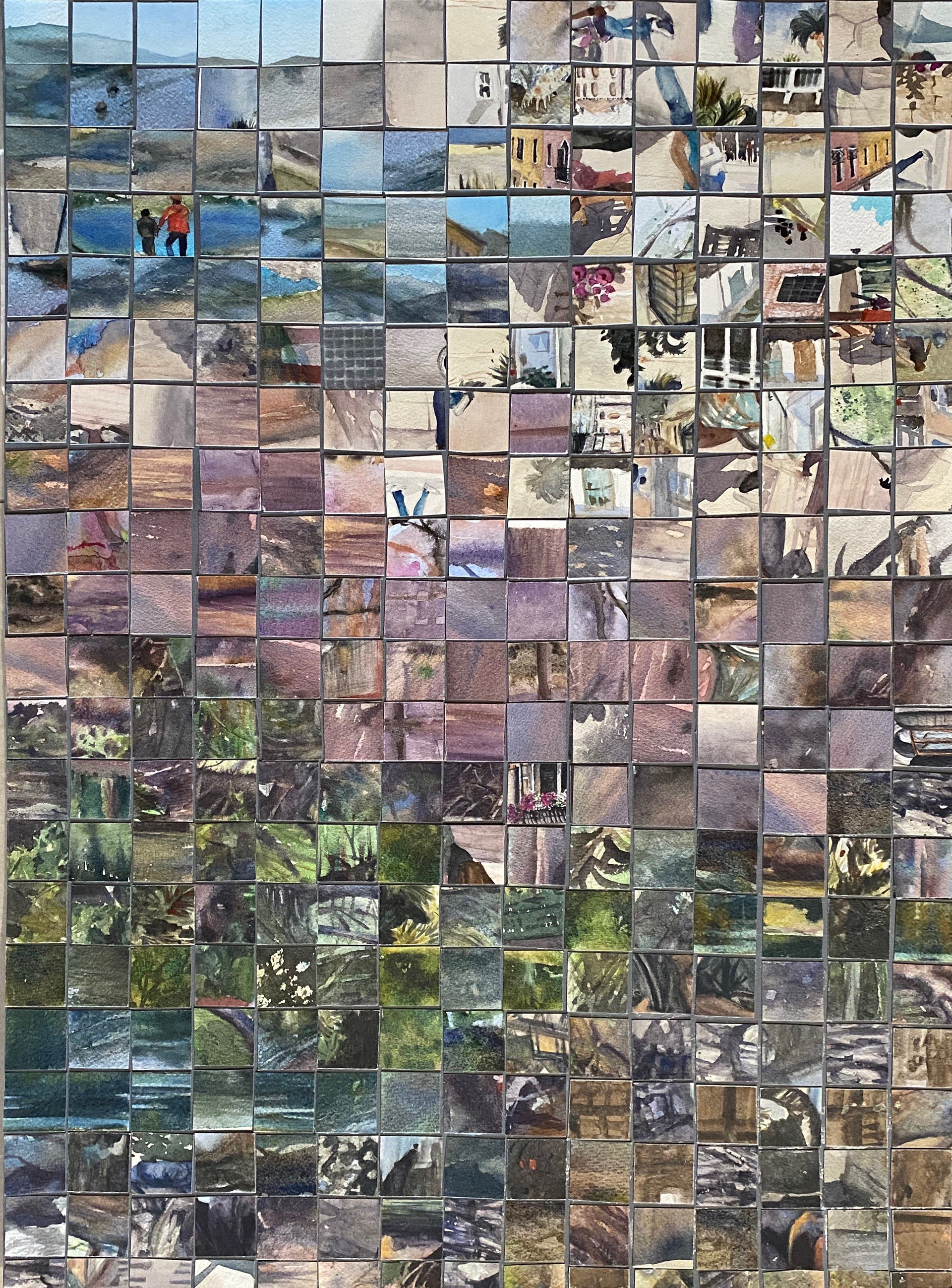 Cada quadradinho vem de um estudo de aquarela feito em cima de temas específicos como paisagens, sombras, folhagens e riachos, praias, céus ensolarados, nublados, pessoas distantes dentro de paisagens, ruas de Parati com seus casarios, animais com seus pelos e penas... tudo ai, dentro dos pequenos pixels