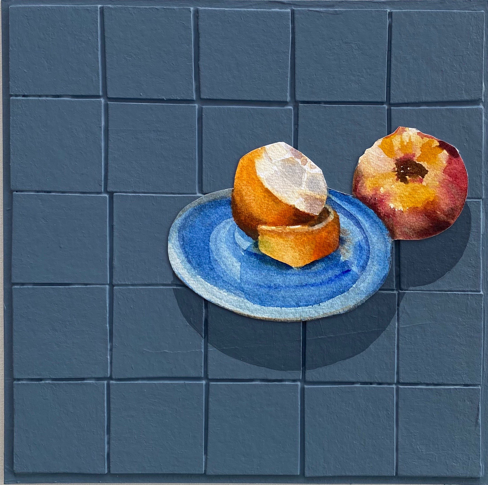 Laranja meio Descascada e Nectarina, 2021. Aquarela e acrílico sobre papel cartão, 27cm x 27cm