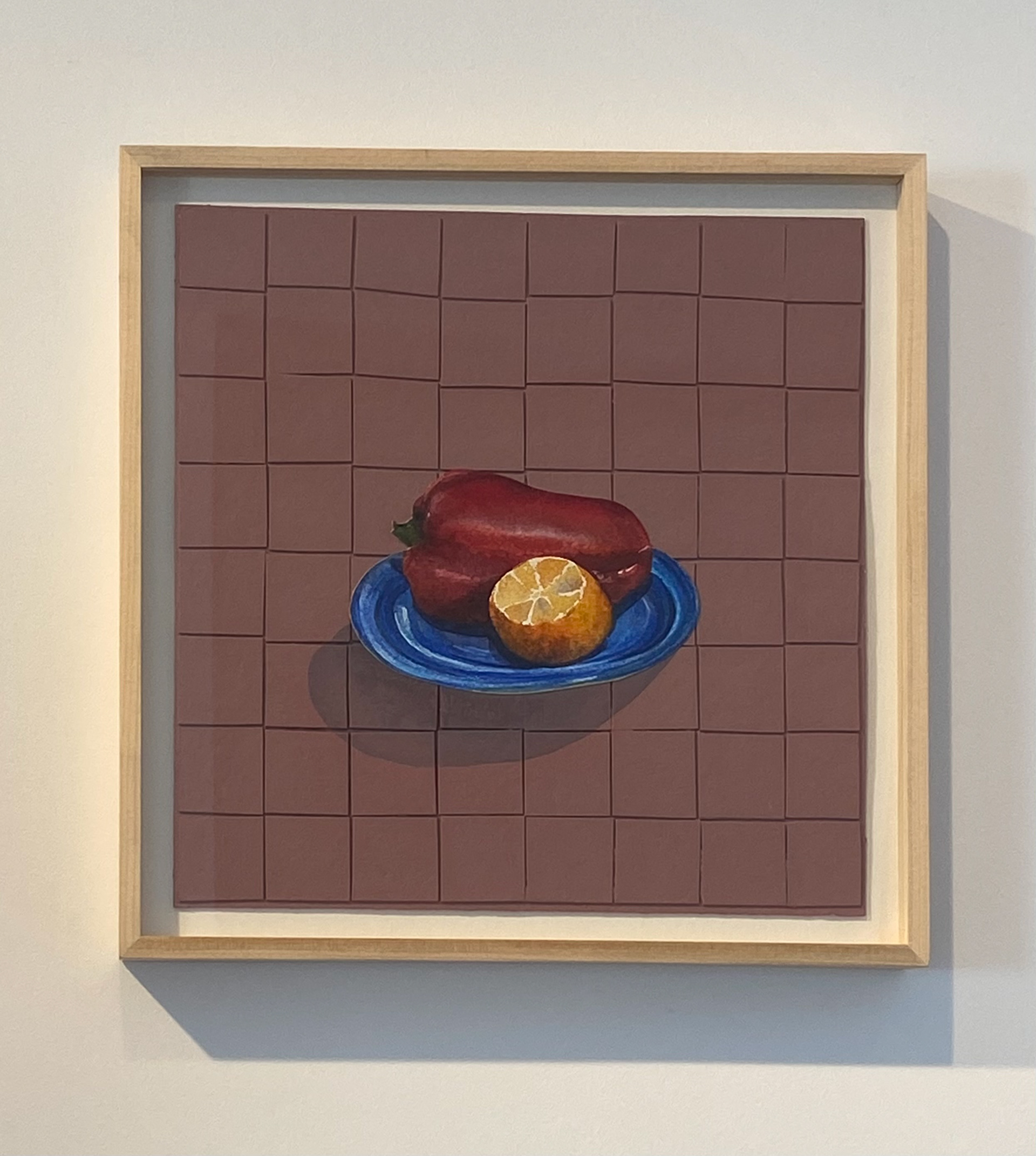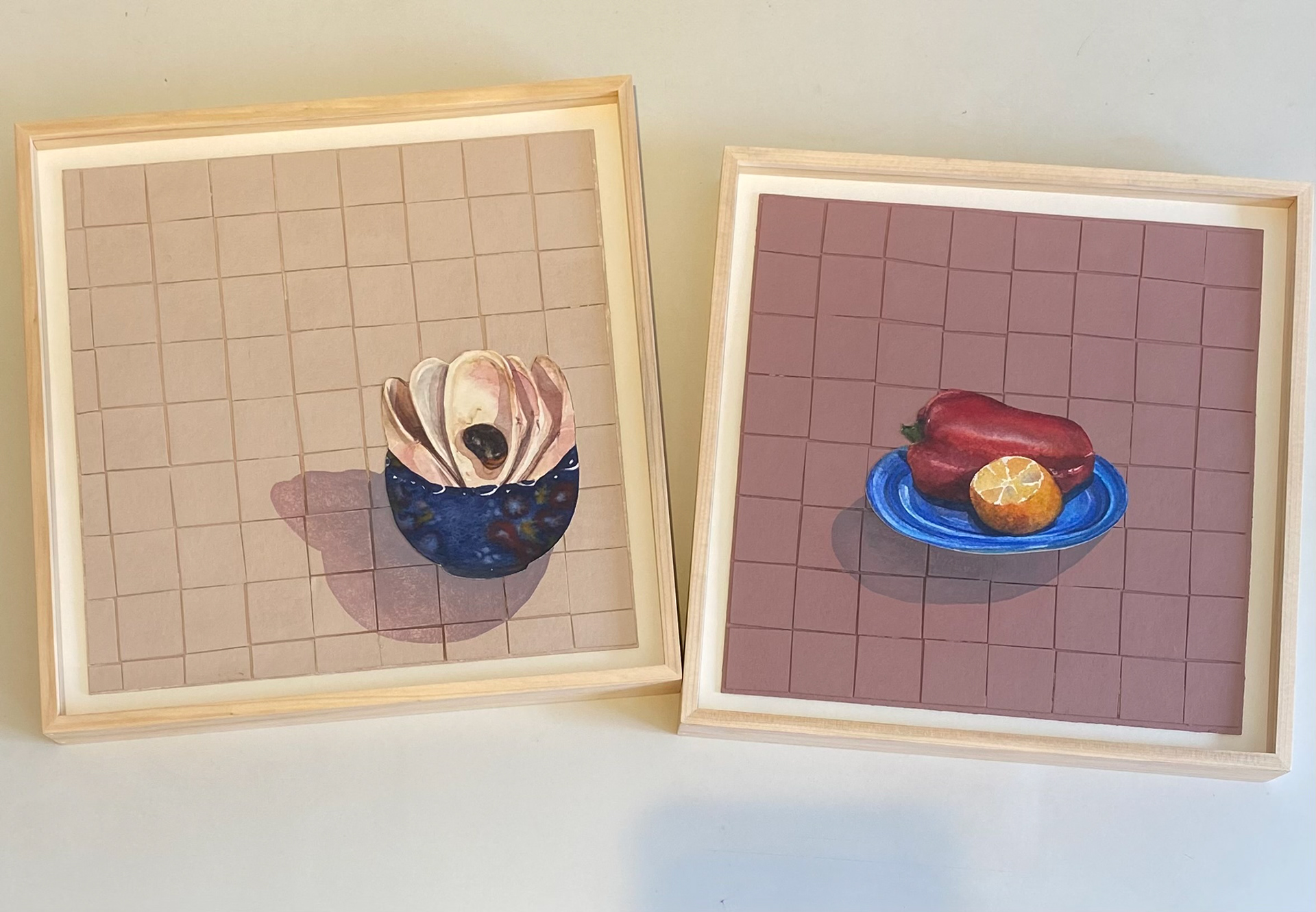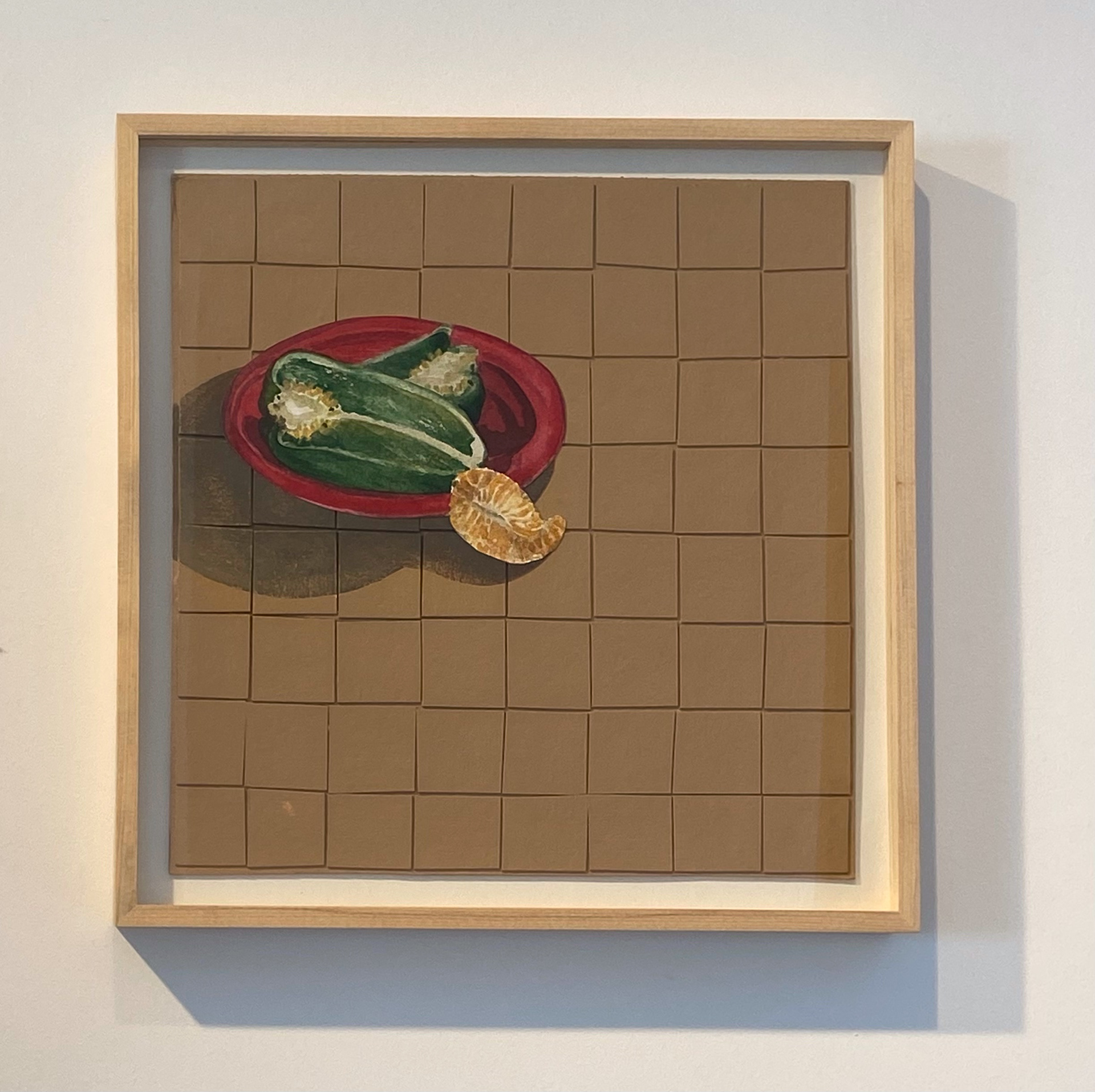Pimentão e Mexerica, 2020. Aquarela e acrílico sobre papel cartão, 38cm x 38cm, com moldura madeira natural e vidro