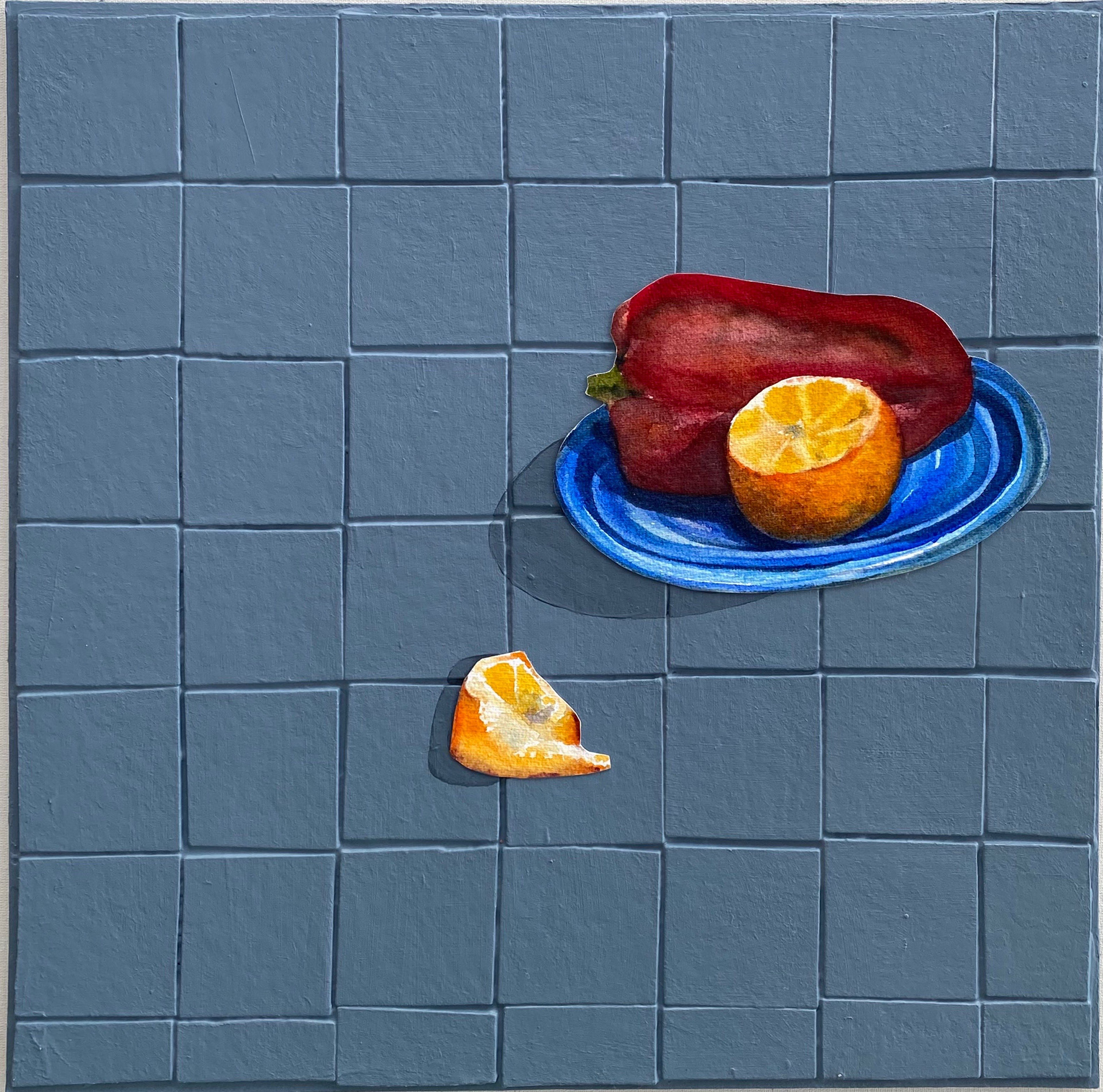 Pimentão e meia Laranja, 2021. Aquarela e acrílico sobre papel cartão, 35cm x 35cm